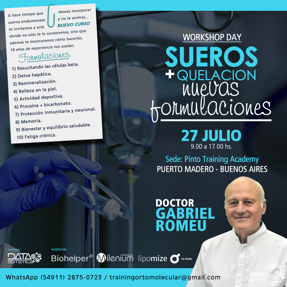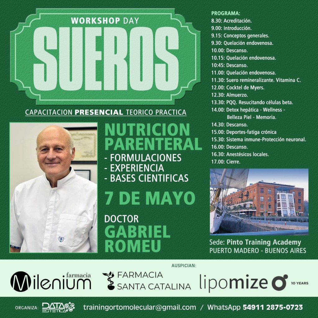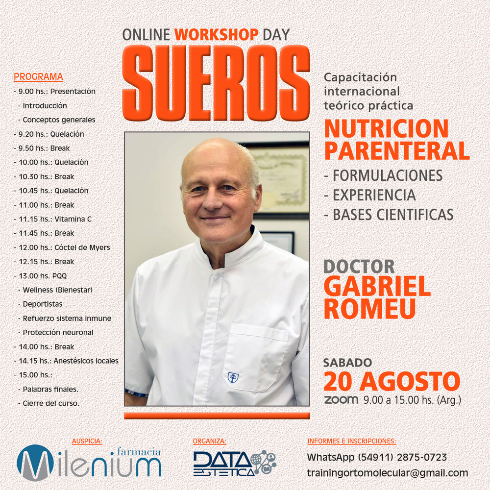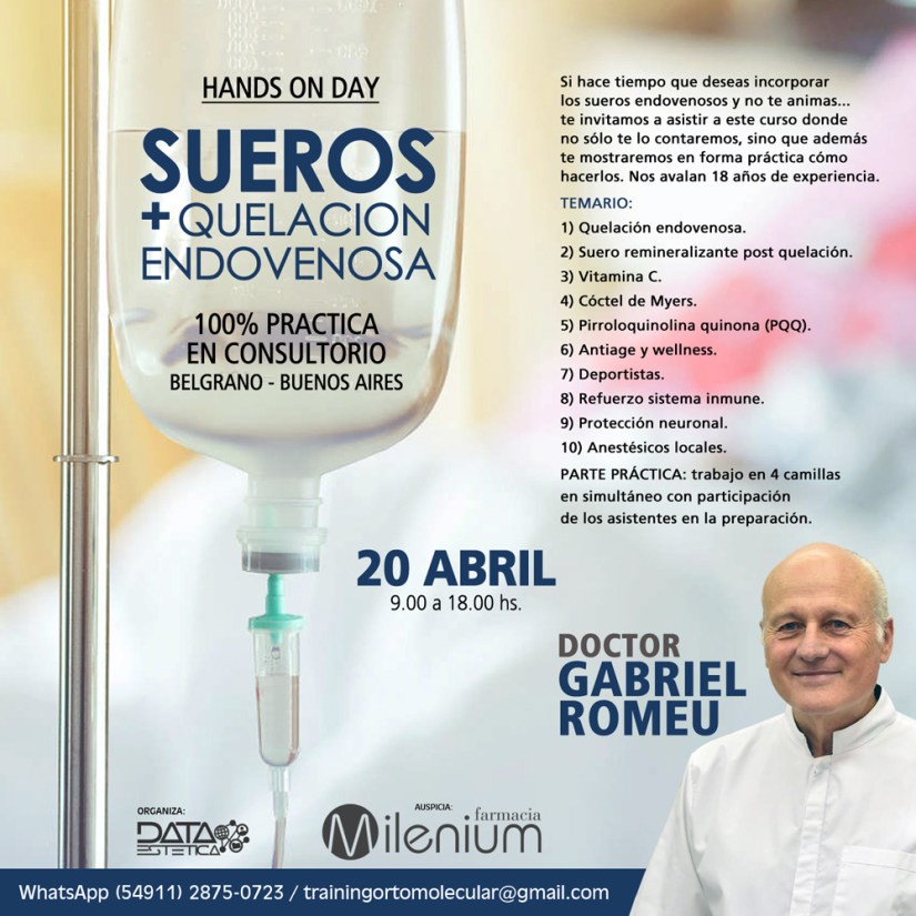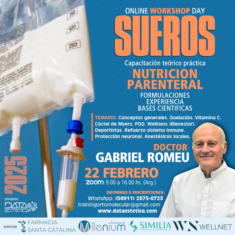 Temario: Formulaciones. Experiencia. Bases científicas. Conceptos generales. Quelación. Vitamina C. Cóctel de Myers. PQQ. Wellness (Bienestar). Deportistas. Refuerzo sistema inmune. Protección neuronal. Anestésicos locales.