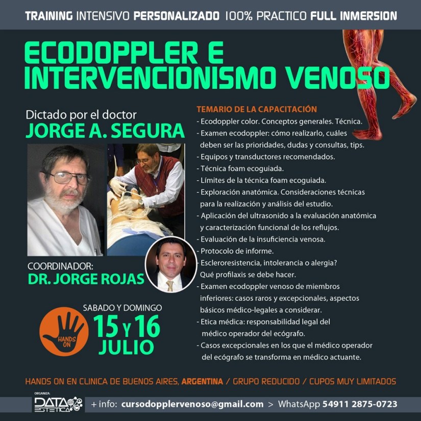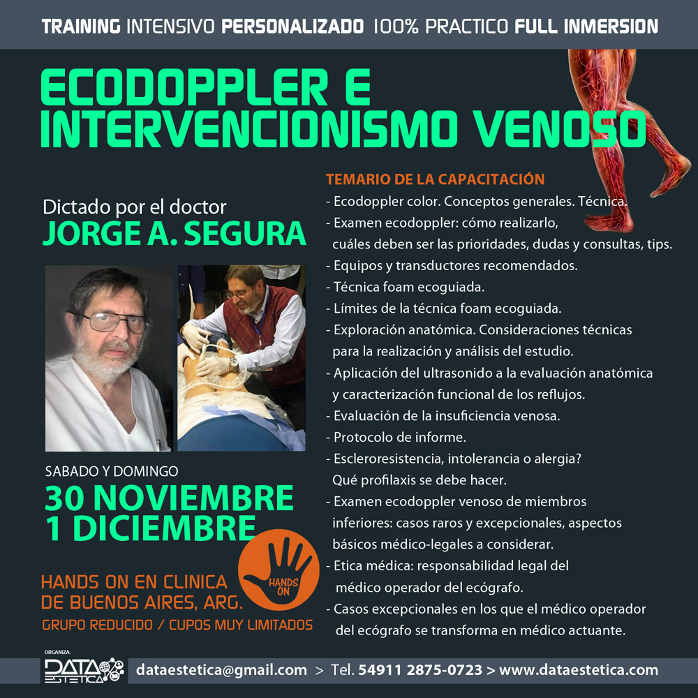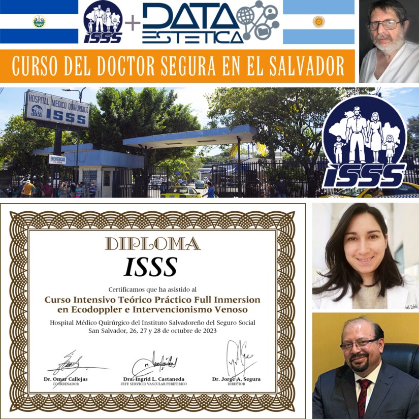 En el marco de un convenio celebrado entre Data Estética y el Hospital Médico Quirúrgico del Instituto Salvadoreño del Seguro Social (ISSS), los días 26, 27 y 28 de octubre de 2023 se llevó a cabo en las instalaciones de ese centro médico, ubicado en la ciudad de San Salvador, el «Curso Intensivo Teórico Práctico Full Inmersion en Ecodoppler e Intervencionismo Venoso», a cargo del doctor Jorge A. Segura.
